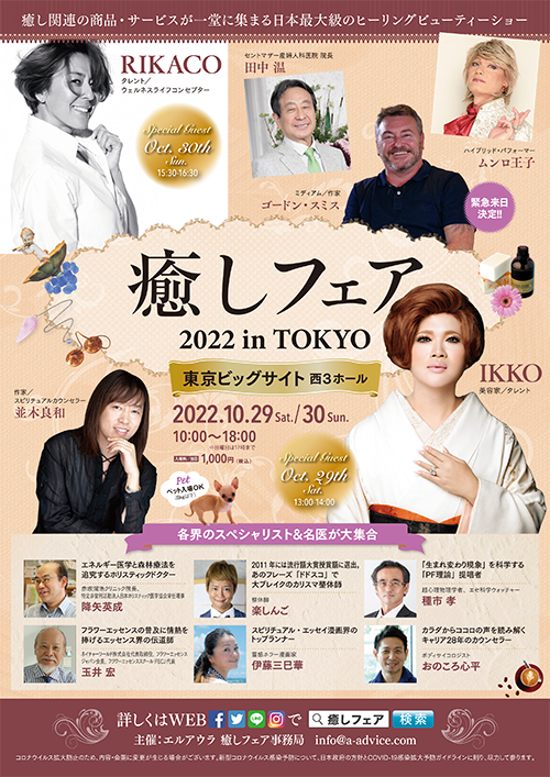 日本最大級の癒しのイベントで東京・大阪・博多にて開催している。主催は弊社エルアウラ。毎年著名なゲストを及び心とカラダそして地球にやさしい癒し関連の商品・サービスが一度に体感できるイベントです。無料で楽しめる講演会や・ブースも多数出展しています。