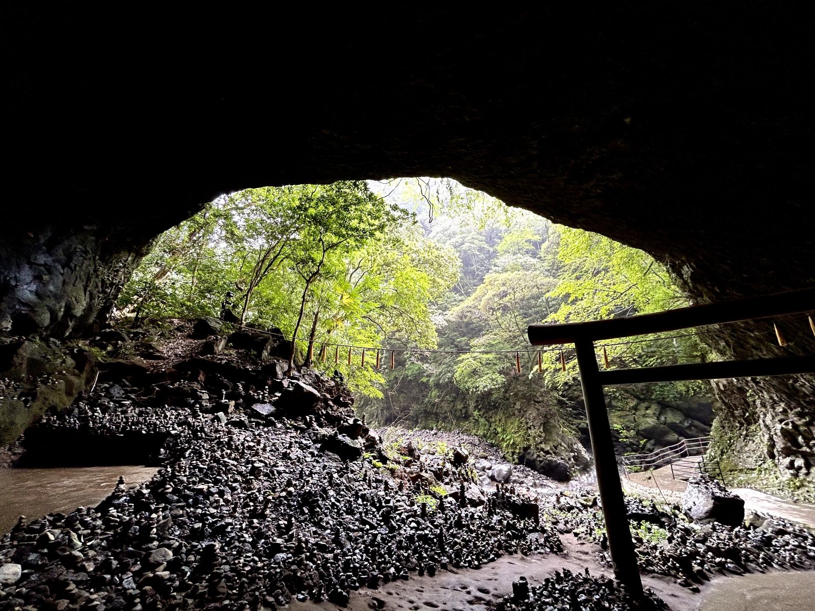 天照大神が岩戸にお隠れになった時、八百万の神々が集まり神議されたと伝えられる大洞窟の河原。戦後のいつからか「願いを込めて小石を積むと願いが叶かなう」との風習が広がり石積みの祈願によって、無数に積まれた石が特徴的。洞窟の中にある神社の佇まいはとてもプリミティブで神秘的で。御祭神として、思兼神(オモイノカネノカミ)、八百萬神(ヤオヨロズノカミ)が祀られています。ここで引っ張り出された岩戸が飛んでいった先が、前回の「スピリチュアルジャーニー」と開催地であった戸隠。思兼神は戸隠でも、ハイアーとして私達をサポートくださった智慧の神です。