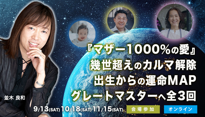 親子の問題、家族の問題、子どもを手放した傷などを癒したい人、自立しても何かしらブレーキを感じる人、先祖の因果因縁から解き放たれたい人、育児中の方、親の介護や終末期に対面している人、教育に携わる人、多くの人に参加していただき、小さな命と大きな命の支え合いや地球人としての相互支援、命のサイクルまで並木さんと共に学んでいければ、きっと大きな変化が個人のみならず、その家族で、そのコミュニティで起きてくるでしょう。