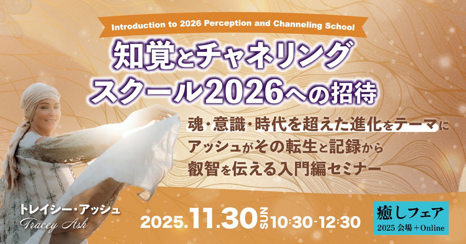 この癒しフェア有料セミナーでは、2026年の年間スクールの入門編として、スクールの内容の一部を公開いたします。また、その場だけでも意識とパワーの高まりを経験していただくことができるでしょう。目の前で、アッシュのエネルギーを感じられるこの貴重なセミナーに、是非ともご参加ください!