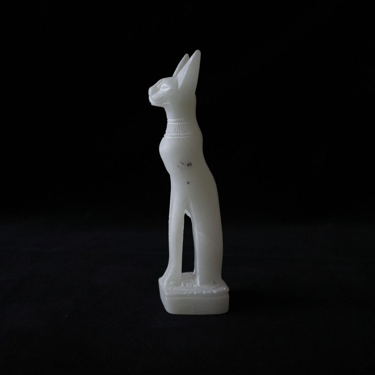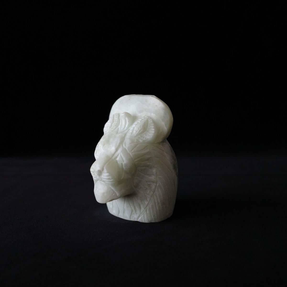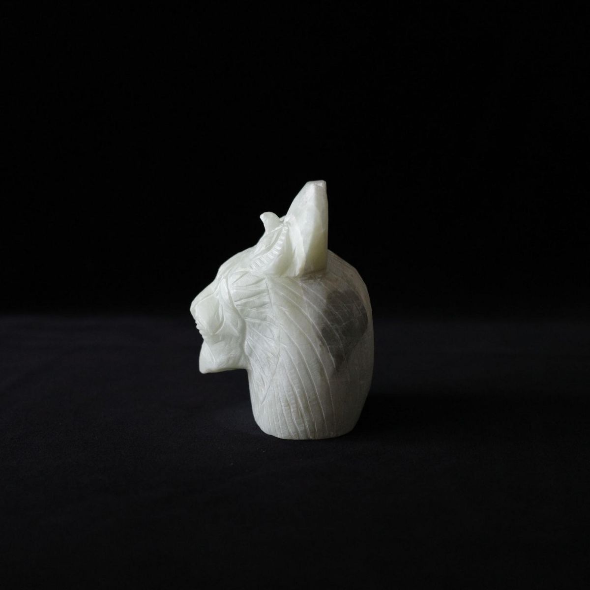ホワイトカルサイトは、意識を浄化し、高次の導きとつながるための石ともいわれています。多くの作品には、古代エジプトで神聖視されてきた動物たちがモチーフとして彫り込まれており、見る者の魂を呼び覚ます象徴的なアートピースとなっています。