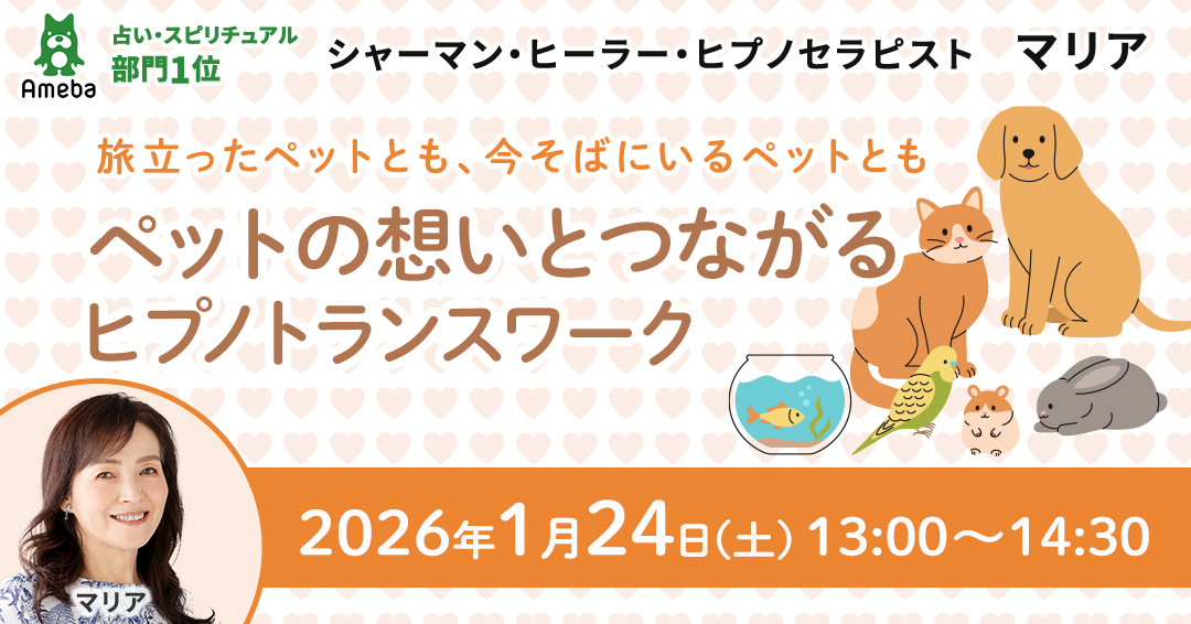 今回のマリアさんのワークショップでは、リーディングとヒプノトランスを通して、ペットの気持ちを感じ、心を通わせる体験を行います。特別な能力は必要ありません。誰もが持っている「感じる力」をやさしくひらいていきます。