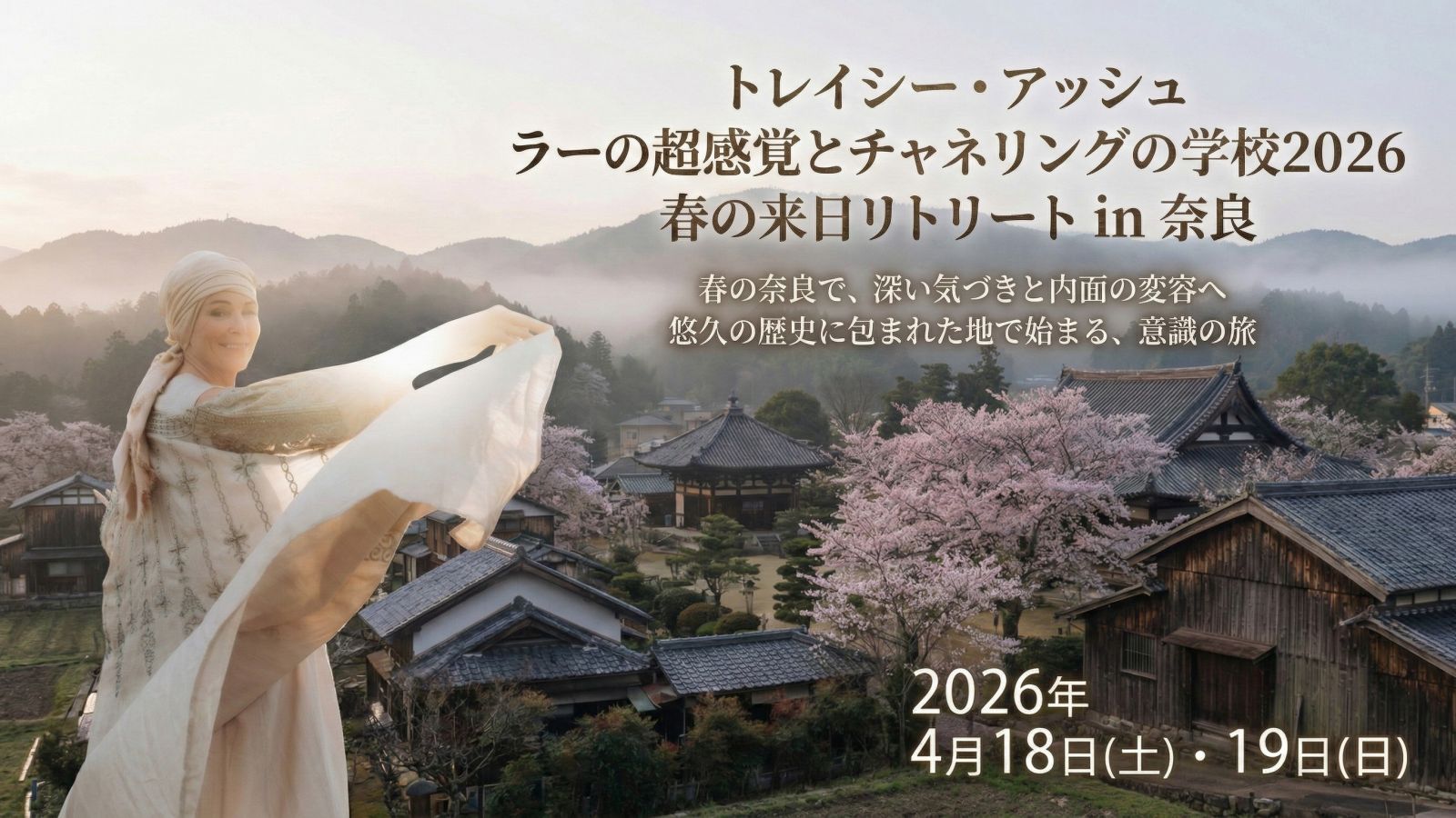 トレイシー・アッシュの4月来日リトリートは、昨年に続き、奈良の飛鳥村周辺で開催します。このリトリートは、トレイシー・アッシュの2026年の年間コース「ラーの超感覚とチャネリングの学校 2026」のプログラムの一つとなっておりますが、外部からの受講者様も、現地もしくはオンラインでのご参加が可能です。この貴重な機会をどうぞお見逃しなく!