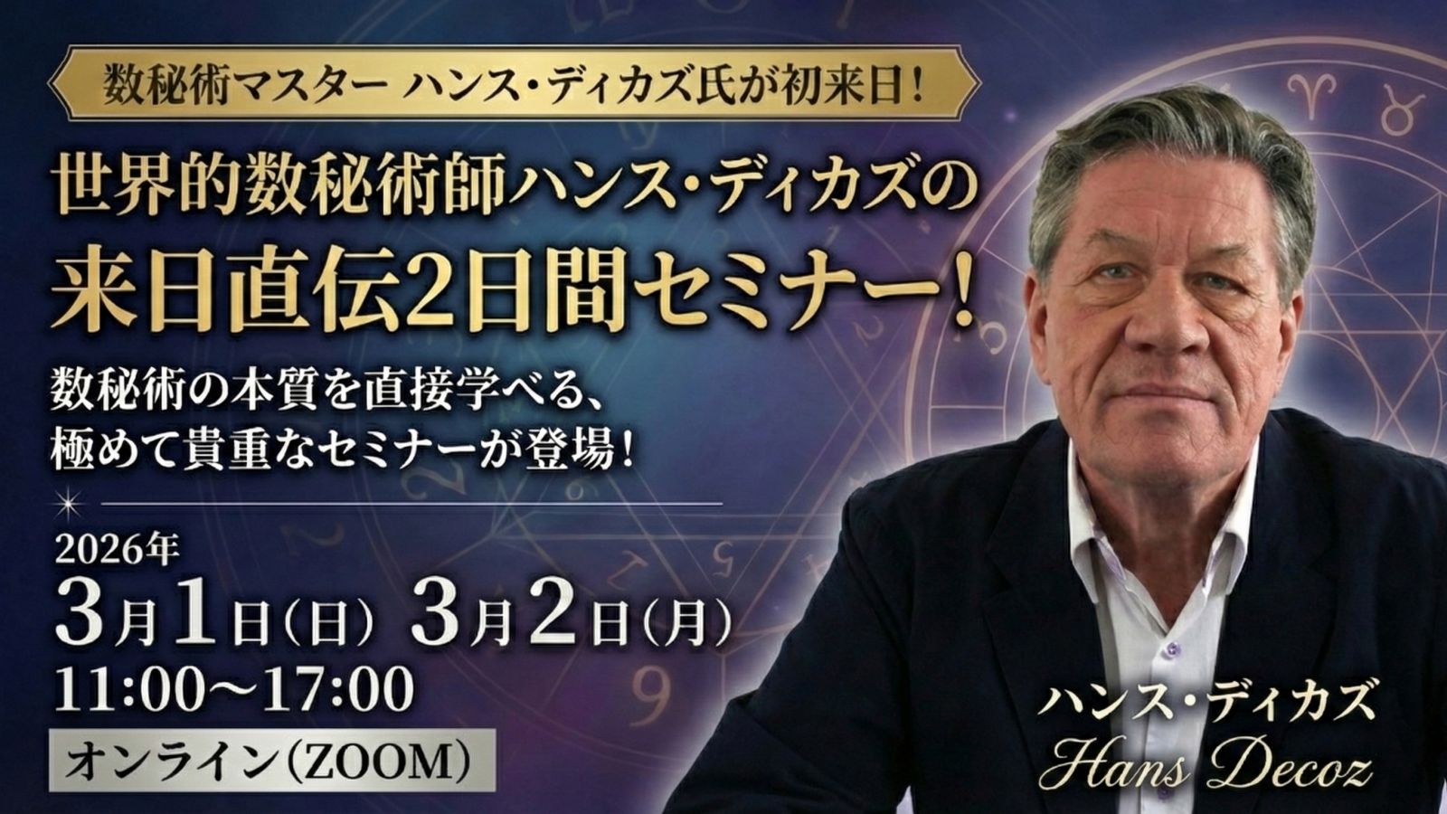 ハンスさんは、長年にわたる探究と実践を通して、独自の「オリジナル・シンボルを用いた数秘術チャート」を体系化してきました。このチャートは現在、世界各地で活用され、多くの実践者に支持されています。彼の数秘術チャートの特徴は、数字の意味を単なる知識として理解するのではなく、その奥に流れる意識の質や感情の動きを、感覚的に捉えられるよう設計されている点にあります。数字が持つ特性やパワーが、どのようにチャートの中に落とし込まれているのかは、長年の経験と洞察の結晶とも言えるものです。本セミナーでは、そのチャートが生まれた背景や思想、そして実際の活用法について、ハンスさんご本人から直接話を聞くことができます。数秘術の本質に触れる、非常に貴重な時間となることでしょう。